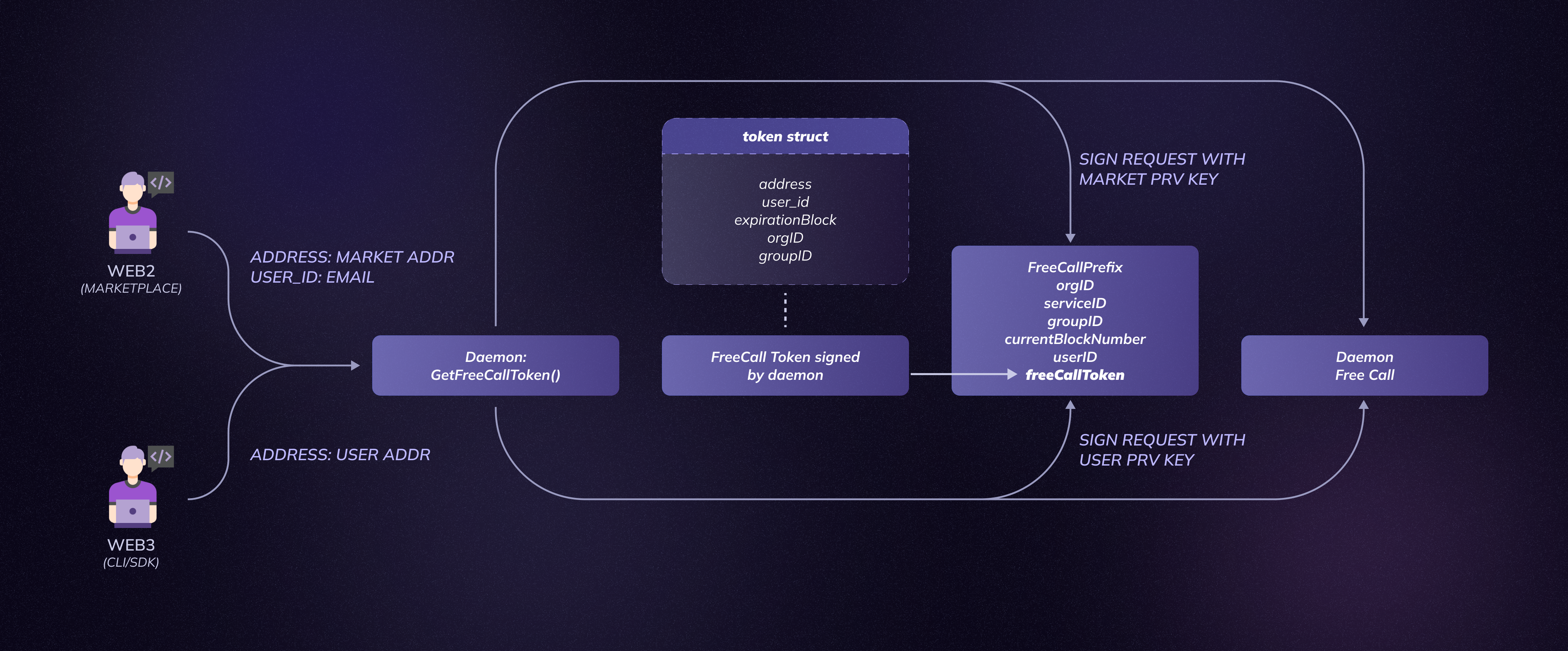 Previously, Free Call tokens were issued and signed centrally by the marketplace backend. This made services dependent on the centralized infrastructure and introduced a trust assumption.